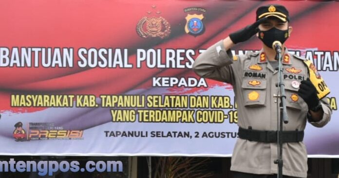 Tapsel, Sumtengpos - Kapolres Tapanuli Selatan AKBP Roman Smaradhana Elhaj MH yang dikenal tegas dan peduli ini bersama personil menyalurkan 1000 paket Bantuan Sosial kepada masyarakat terdampak Covid_19 di Kabupaten Tapanuli Selatan dan Kabupaten Padang Lawas Utara 2/8/21.