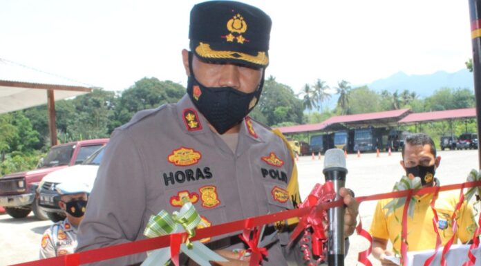 Panyabungan, Sumtengpos - AKBP Horas Tua Silalahi, S.I.K, M.Si meresmikan lokasi fitnes khusus untuk personil Polres Madina berolahraga di halaman parkir barak lajang Mako Polres Madina, Jum'at (19/03/2021).