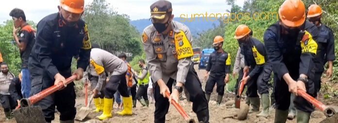 Tapsel, Sumtengpos – Prihatin dengan kondisi jalan yang rusak menahun di Dusun Batu Jomba Desa Bulu Payung Kecamatan Sipirok Kabupaten Tapanuli Selatan, Kapolres Tapanuli Selatan Pimpin Kerja Bakti TNI-Polri Perbaiki Jalan Rusak Batu Jomba, Minggu (21/03)