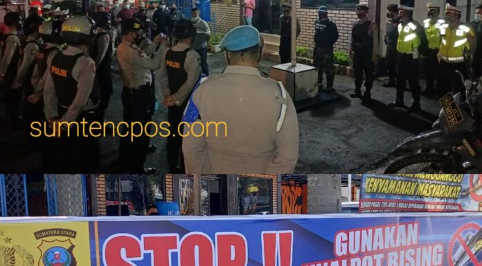 Padangsidimpuan, Sumtengpos- Penertiban Sepeda motor knalpot blong dan resing Polres Padangsidimpuan dibawah Komando AKBP Juliani Prihartini pimpin apel bersama malam piket oncall Personil Polres Padangsidimpuan Lapangan Poslantas Kota Polres Padangsidimpuan 27/3/21.