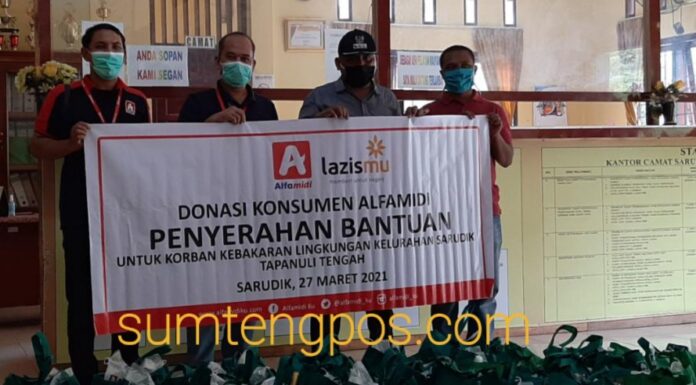 Tapteng, Sumtengpos - Sebagai bentuk kepedulian terhadap korban kebakaran yang terjadi di kawasan kelurahan Sarudik, Tapanuli Tengah. Pada kesempatan kali ini gerai Alfamidi kembali memberikan bantuan yang diserahkan melalui camat Sarudik, Sabtu (27/3/2021).