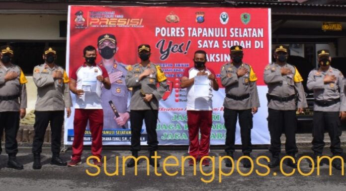 Tapsel, Sumtengpos - Sebanyak 424 Personil Polres Tapanuli Selatan, akhirnya selesai menerima suntikan Vaksin Sinovac Tahap 1. Selain Personil, penyuntikan vaksin juga diberikan kepada seluruh PNS, PHL dan tenaga medis di Polres Tapanuli Selatan. Hal ini disampaikan Kapolres Tapanuli Selatan AKBP Roman Smaradhana Elhaj, SH, SIK, MH, Rabu (17/3) saat meninjau Pelaksanaan Vaksinasi di Aula Pratidina Mapolres Tapsel.