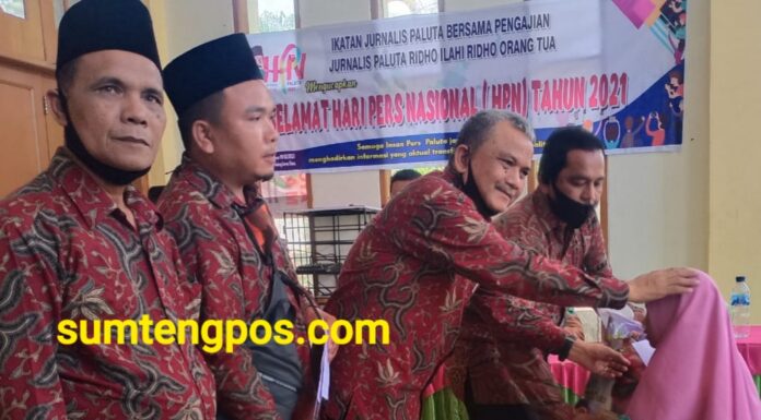 Paluta, Sumtengpos - Hari Pers Nasional ( HPN) ke-75 tahun 2021 diperingati hari ini, dimana di Gunungtua kegiatan Ikatan Jurnalis Paluta Bersama Pengajian Jurnalis Paluta Ridho Ilahi Ridho Orang Tua memberikan santunan tali asih kepada Anak Yatim, acara ini dilaksanakan di Aula Masjid Raya Paluta 9/2/21.