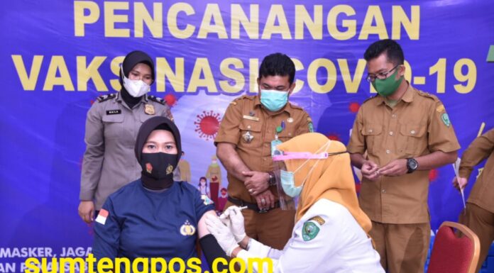 Kapolres Padangsidimpuan tanpak hadir dalam kegiatan Pencanangan Vaksinasi Covid - 19 dan dihadiri Forkopimda di kantor Walikota Padangsidimpuan 9/2/21.