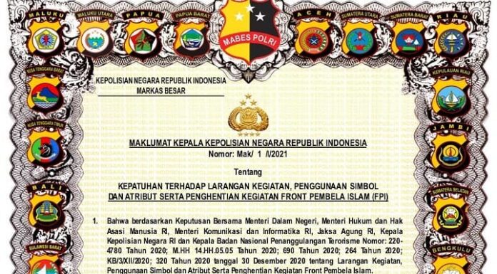 Padangsidimpuan, Sumtengpos – Kepala Kepolisian RI Jenderal Idham Azis menerbitkan maklumat bernomor Mak/1/I/2021 tentang Kepatuhan terhadap Larangan Kegiatan, Penggunaan Simbol dan Atribut, serta Penghentian Kegiatan Front Pembela Islam ( FPI) 1/1/21.