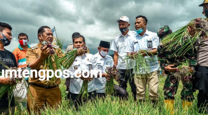 Padangsidimpuan, Sumtengpos - Walikota Padangsidimpuan Irsan Efendi Nasution bersama Kelompok Tani Simangornop Panen Bibit Bawang Merah hasil Penangkaaran di Desa Mompang Kecamatan Padangsidimpuan Angkola Julu, Rabu(25/11).