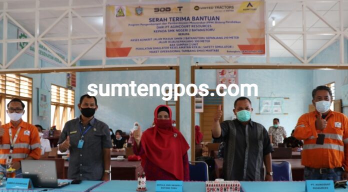 Batangtoru, Sumtengpos - PT Agincourt Resources (PTAR) Pengelola Tambang Emas Martabe memberikan bantuan infrastruktur berupa pembangunan peningkatan akses jalan masuk, pembangunan jalur hijau dan bak sampah, serta dukungan sarana pembelajaran berupa simulator keselamatan kerja dan maket operasional pertambangan kepada Sekolah Menengah Kejuruan (SMK) Negeri 2 Batangtoru Melalui Siaran Pers 28/11/20.