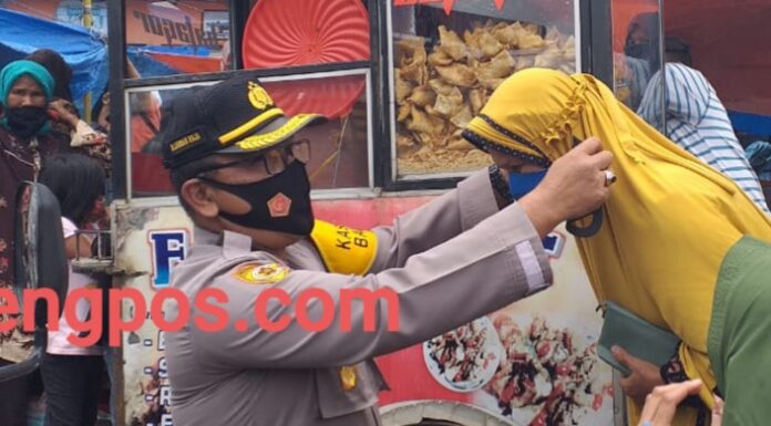 Kampanye adaptasi kebiasaan baru berupa pembagian Masker kepada masyarakat yang melintas di Pasar Pagarutan Angkola Timur Kabupaten Tapsel...