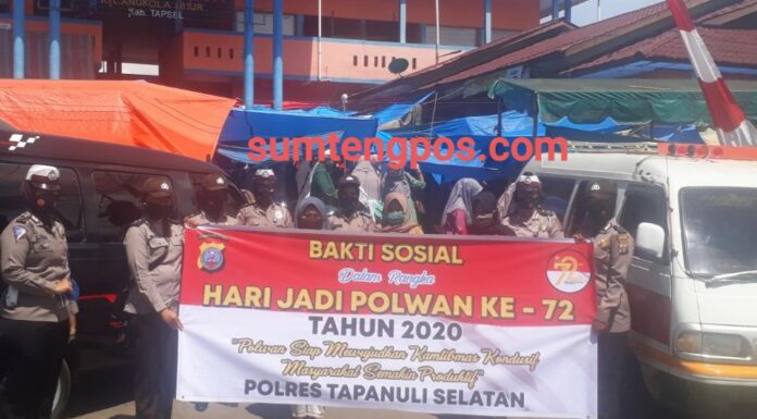 Tapsel, Sumtengpos – Jelang HUT Polwan ke 72, jajaran Polwan Polres Tapanuli Selatan di bawah komando AKBP Roman Smaradhana Elhaj , Jumat (7/8) melaksanan bakti sosial dengan membagikan masker di dua tempat, di Pasar Pargarutan Kecamatan Angkola Timur dan Poken Jonjong Desa Bintuju Kecamatan Angkola Muaratais.